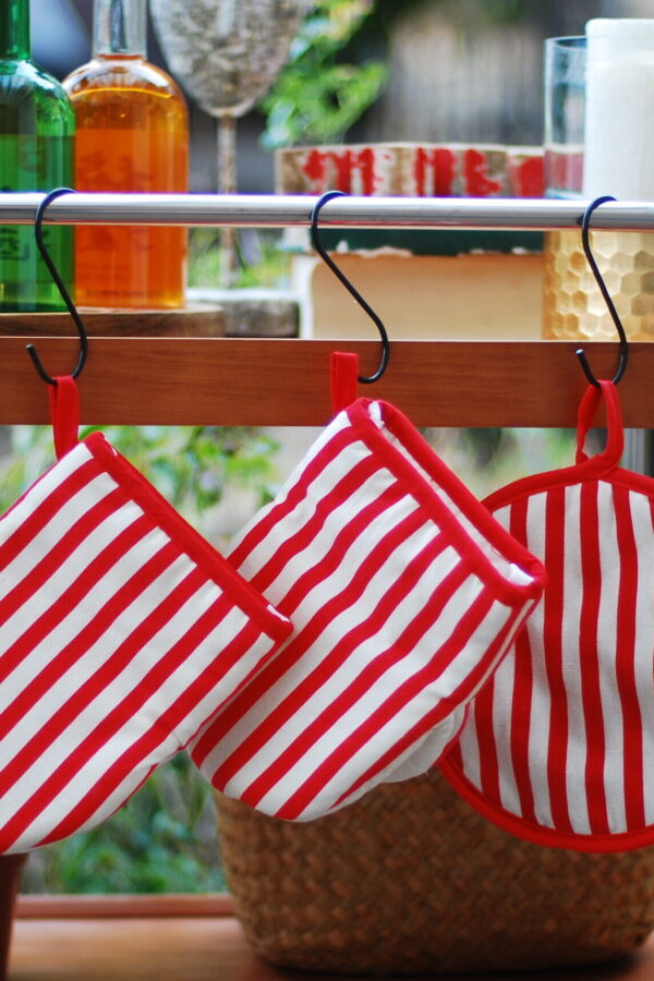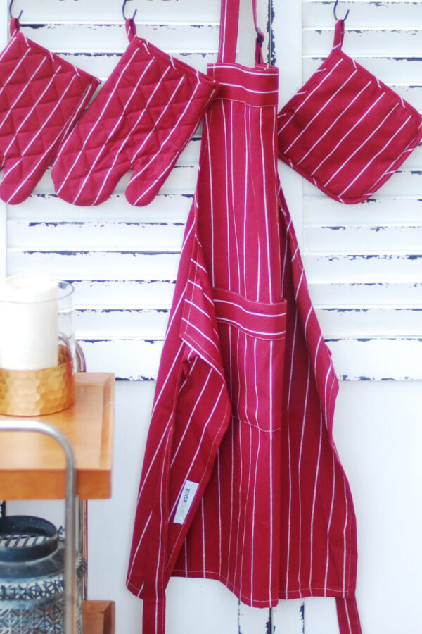 Chef’s Essential Trio, Red Stripes – Apron/Oven gloves/Heat insulation pad