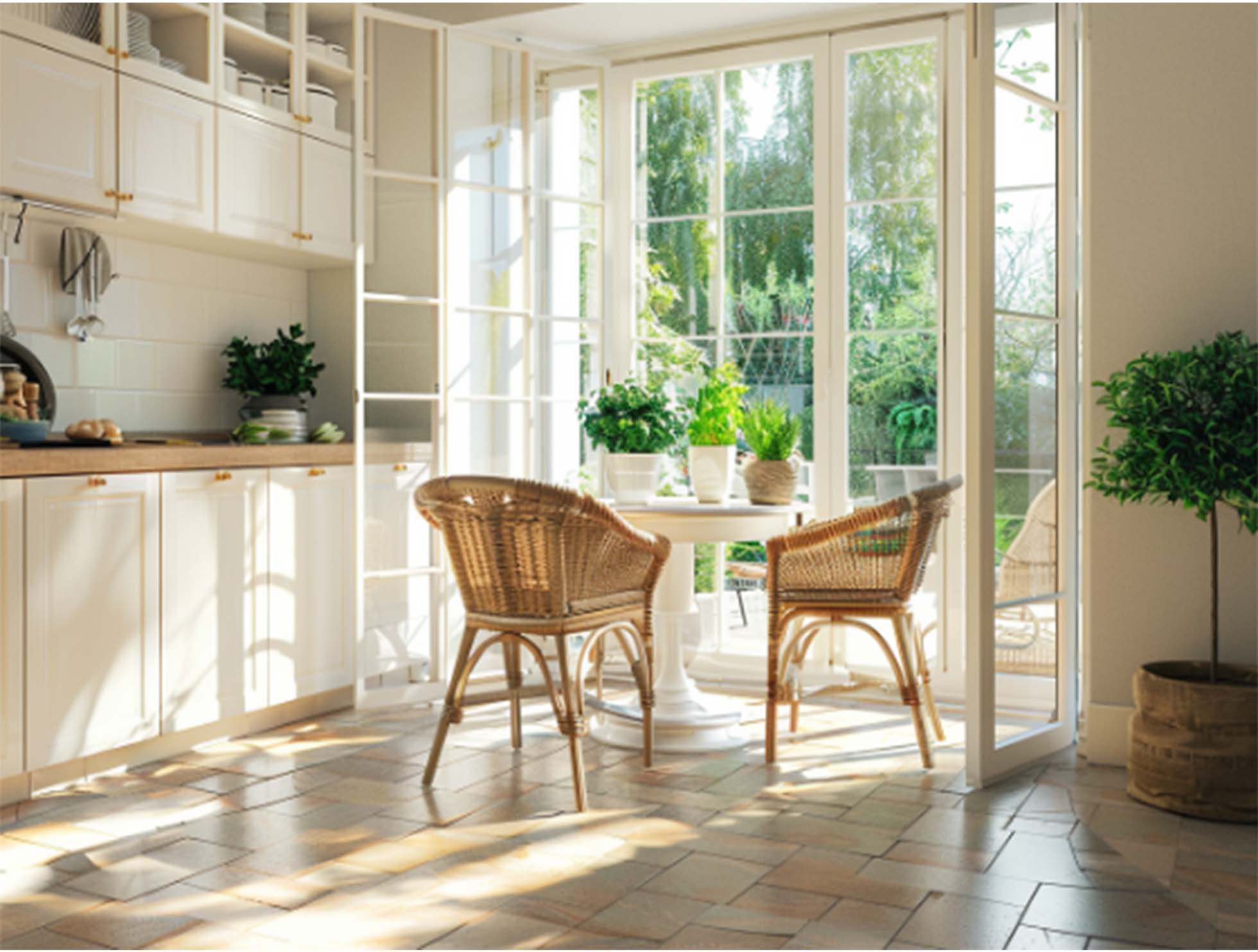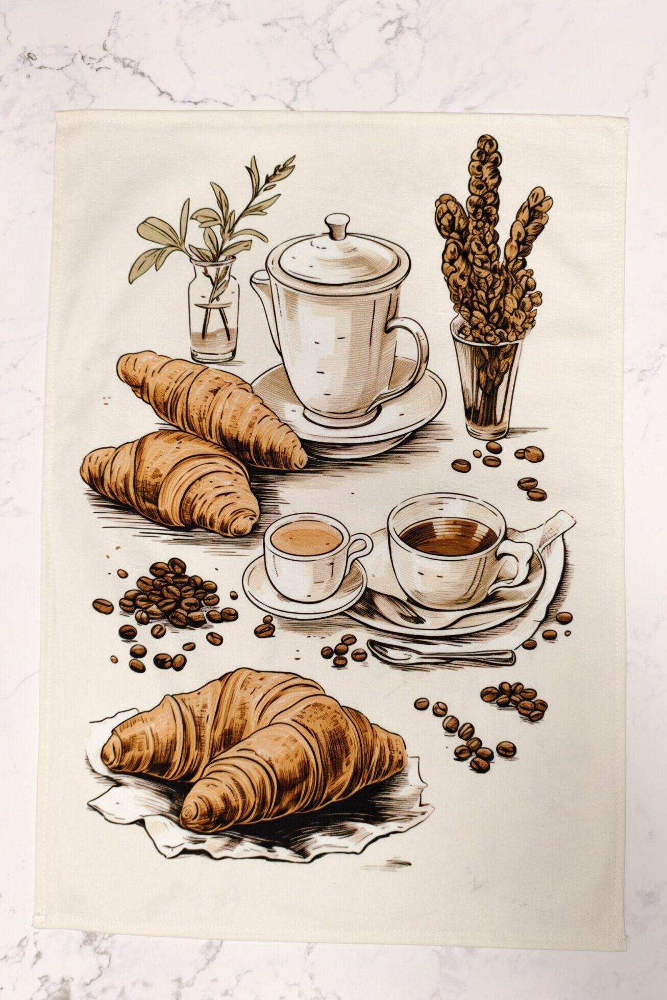 The first ray of morning sunlight spills across the table, where a cup of rich, steaming coffee fills the air with its enticing aroma, gently awakening the tranquility and beauty of the day. Freshly baked golden croissants, crisp and buttery, pair perfectly with the coffee’s fragrance, creating a warm and inviting atmosphere. Beside them, a teapot stands quietly, while a vase with olive branches adds a touch of natural freshness to the scene.