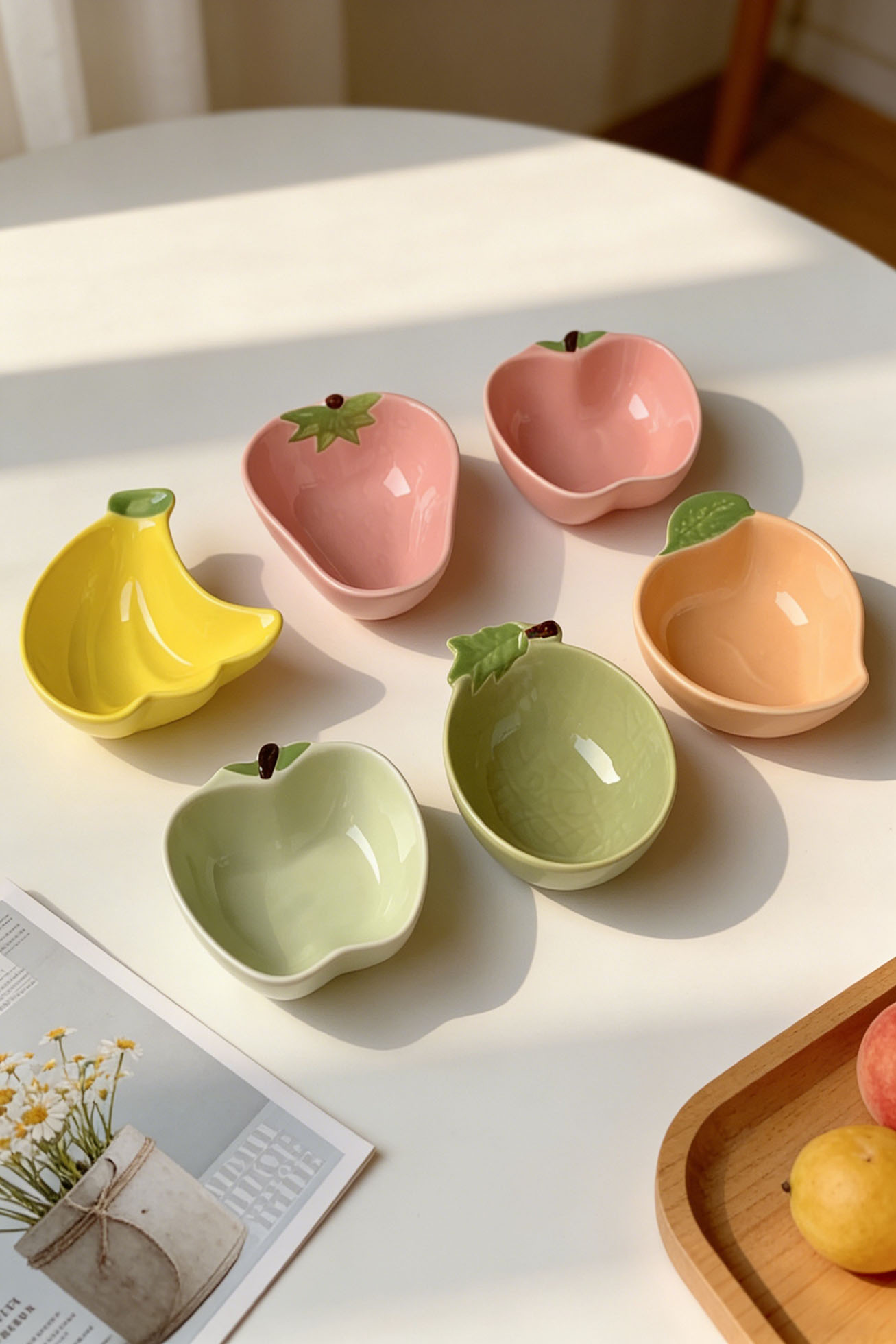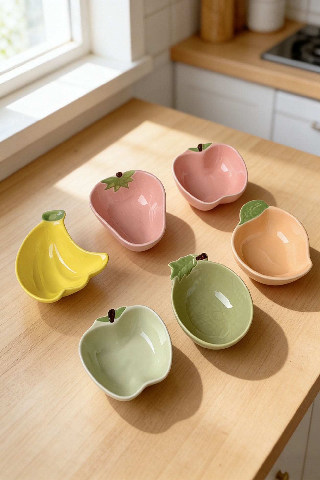 Each piece features a playful fruit-inspired shape and glossy ceramic finish, adding a cheerful touch to your table.