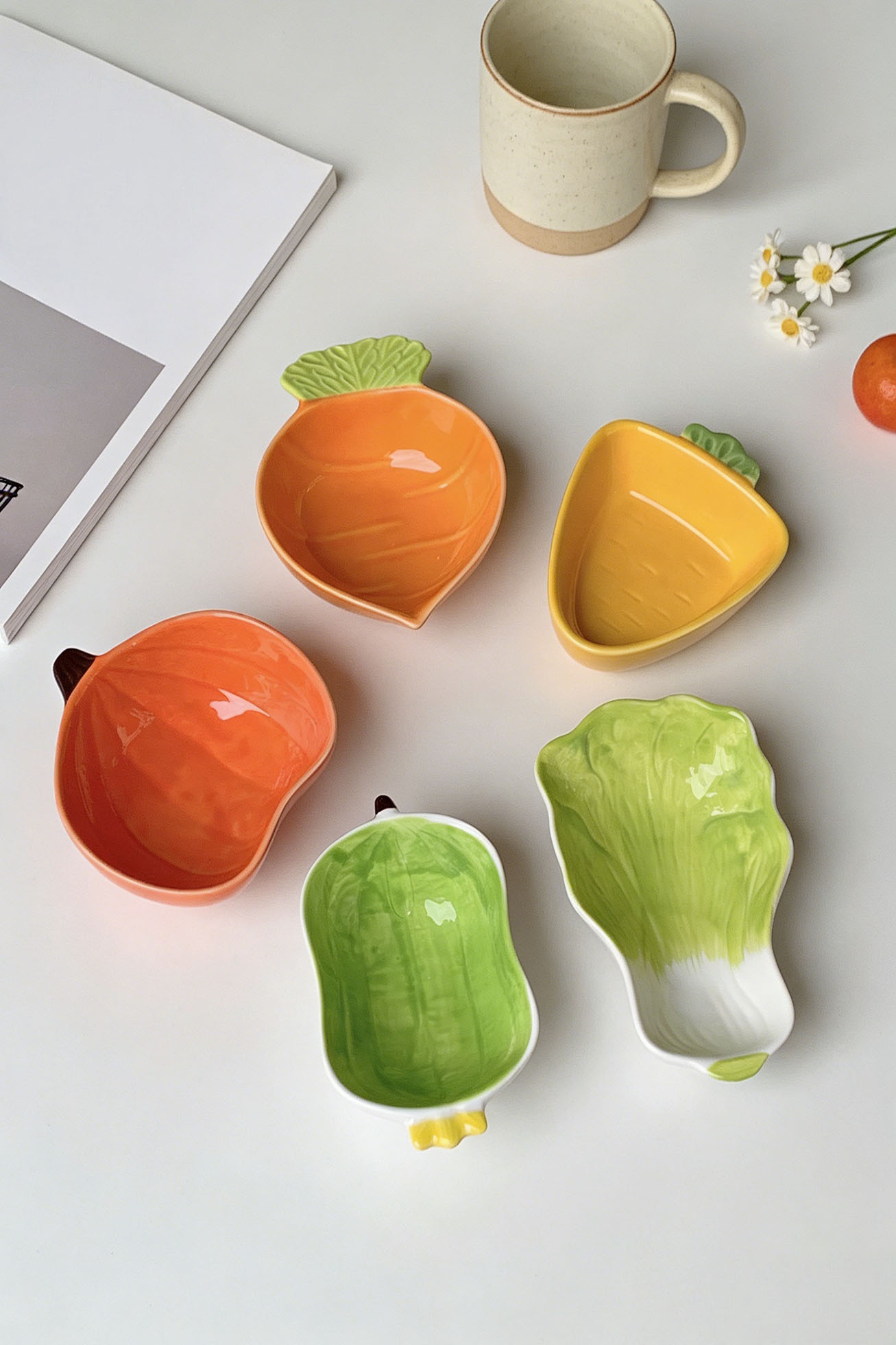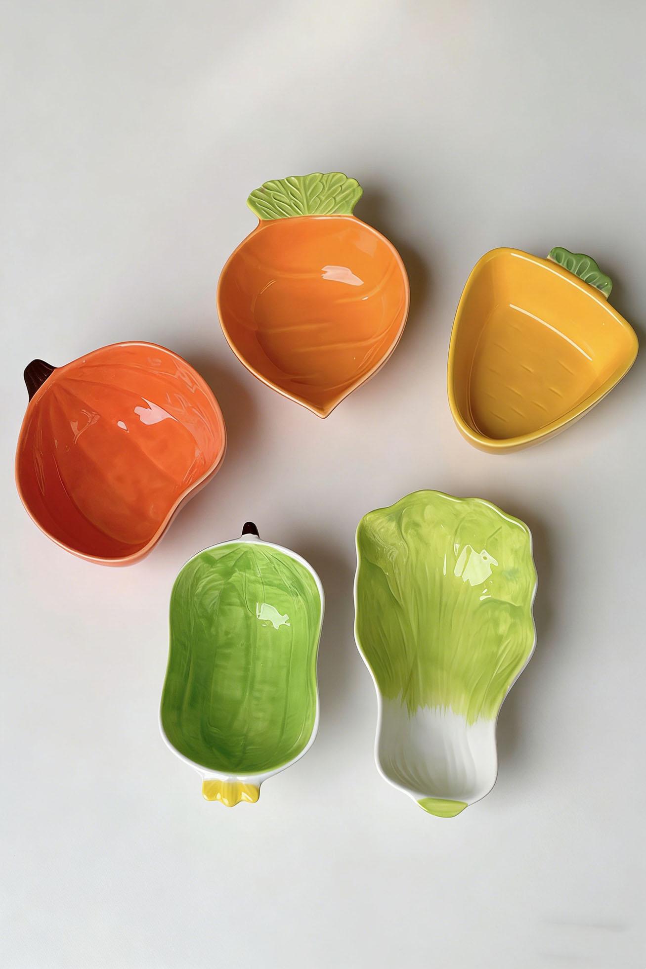 These small ceramic dishes were inspired by the playful shapes of fruits and vegetables — tiny pieces that add a touch of colour and charm to the table.