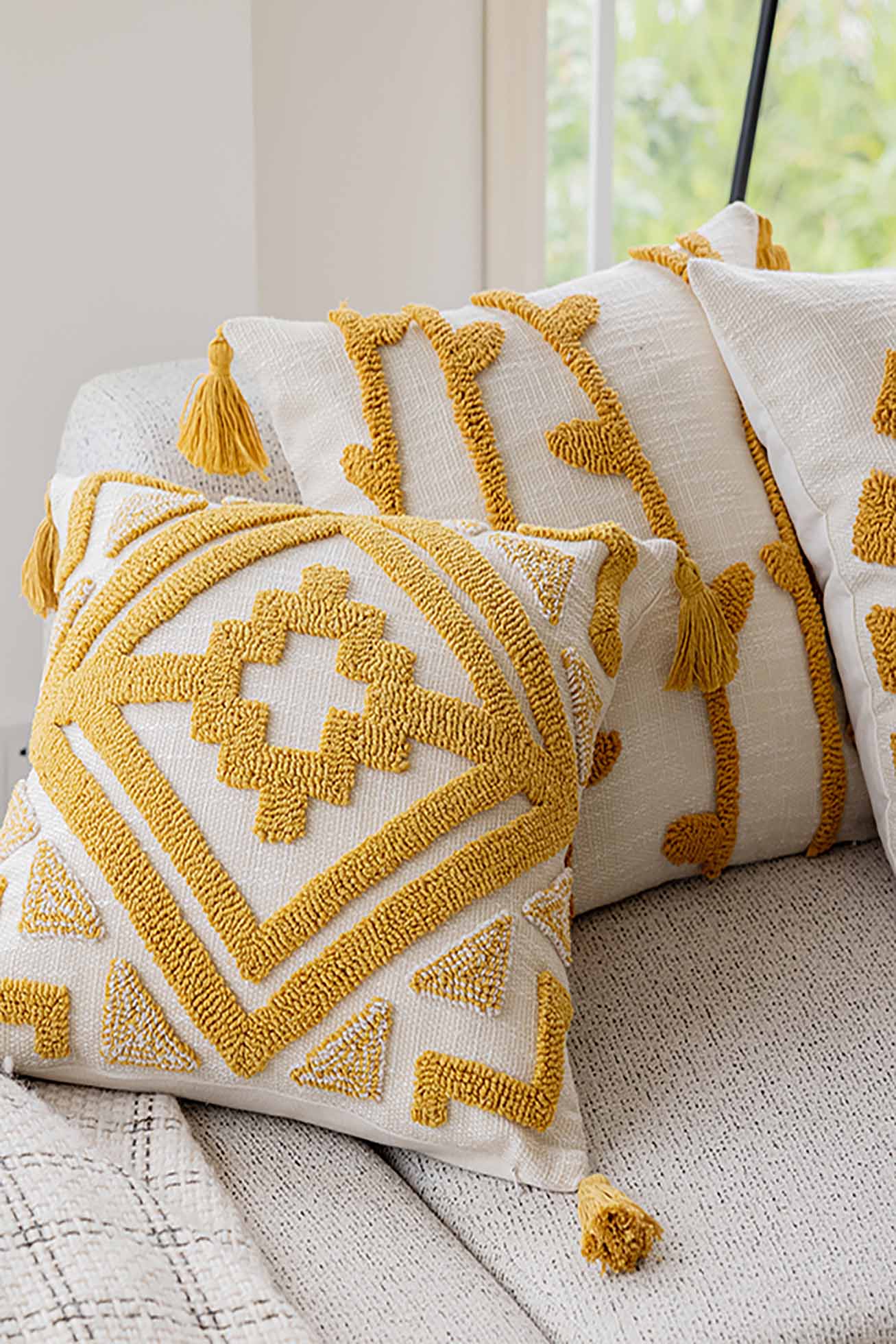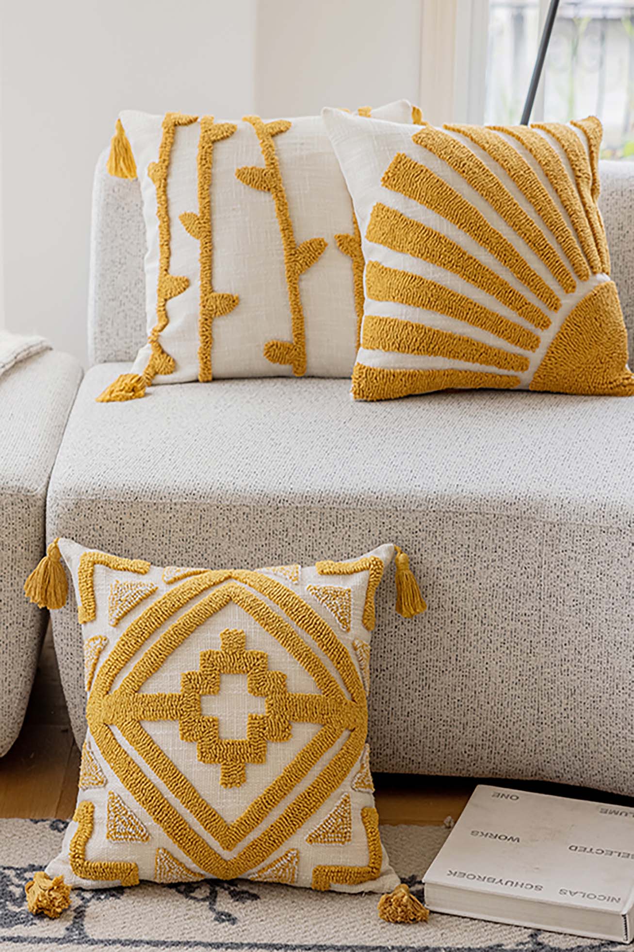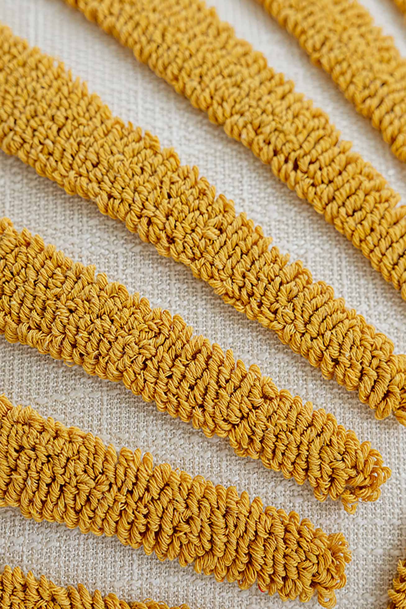 The design was inspired by sunbeams casting sharp patterns across walls on a clear morning. Its bold shapes and warm tones capture the energy and optimism of sunlight. Created to lift both space and spirit, this cushion brings a radiant touch to everyday living.