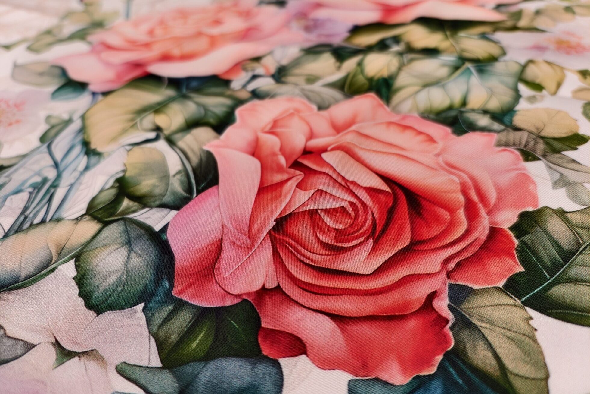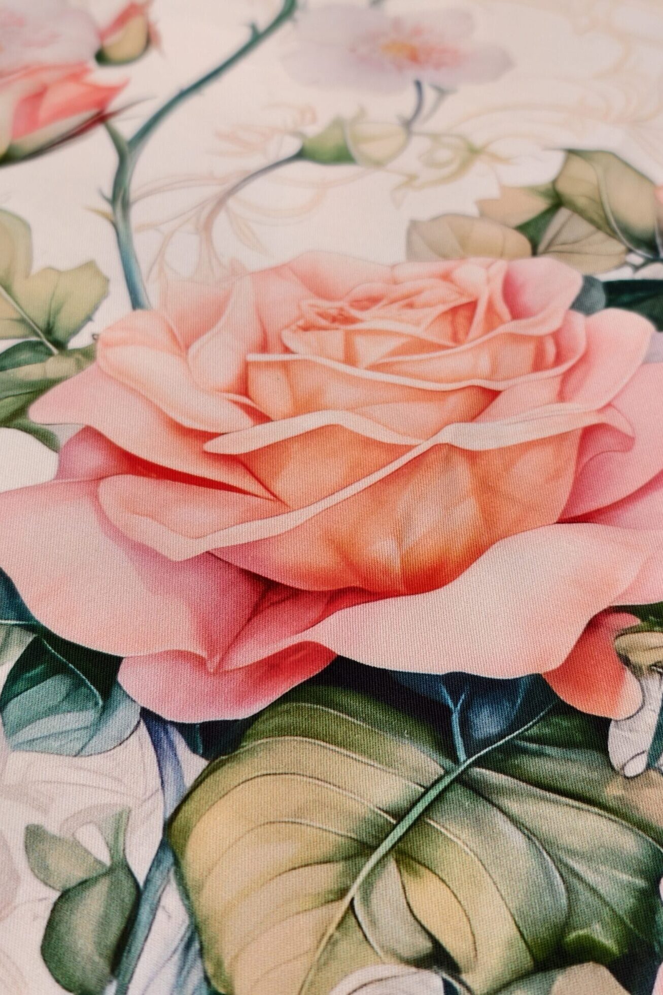 Immerse yourself in timeless beauty with this napkin adorned with delicate pink roses and intricate botanical details. Crafted with care, it brings a sense of romance and refinement to any dining occasion.