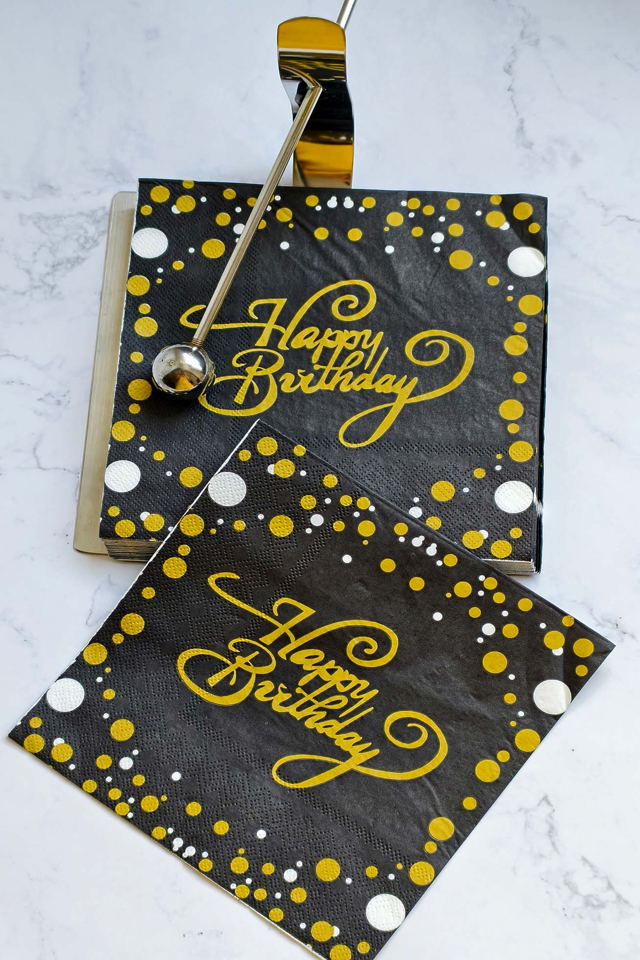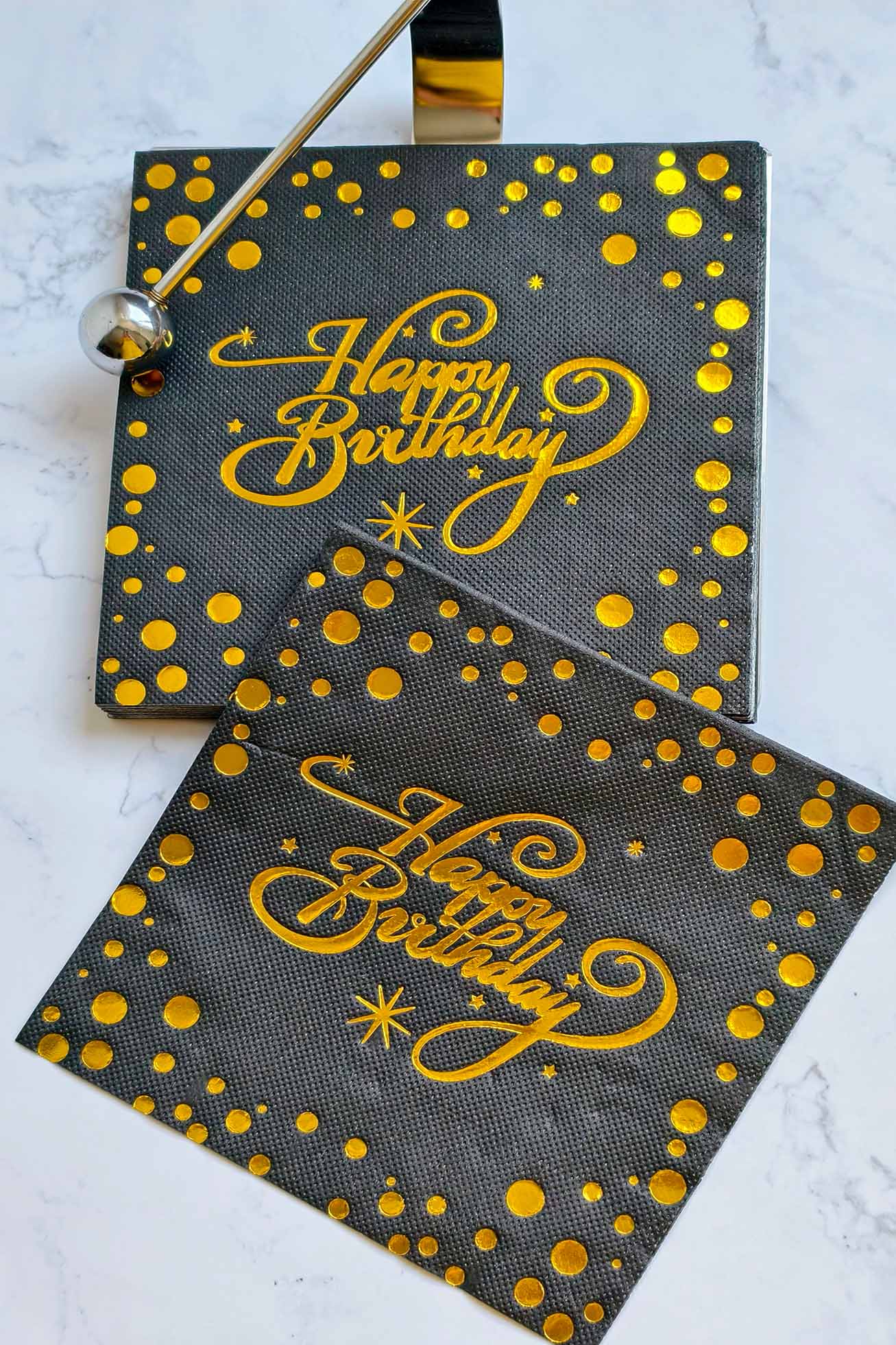 Each pack includes 20 napkins, sized 33 × 33 cm and made with 2-ply soft paper. Bold black background with shimmering gold and silver accents sets the mood for a stylish celebration. Perfect for birthdays.
