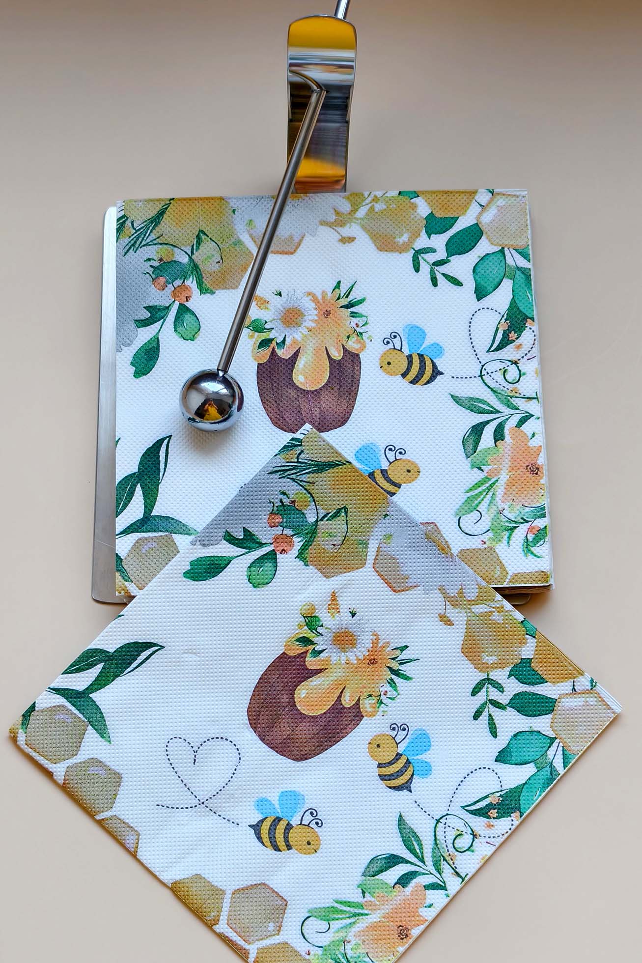 Each pack includes 20 napkins, sized 33 × 33 cm and made with 2-ply soft paper. Cheerful bees buzz among flowers and honeycombs, bringing a playful yet cozy touch. Perfect for spring picnics, garden parties, and family gatherings.
