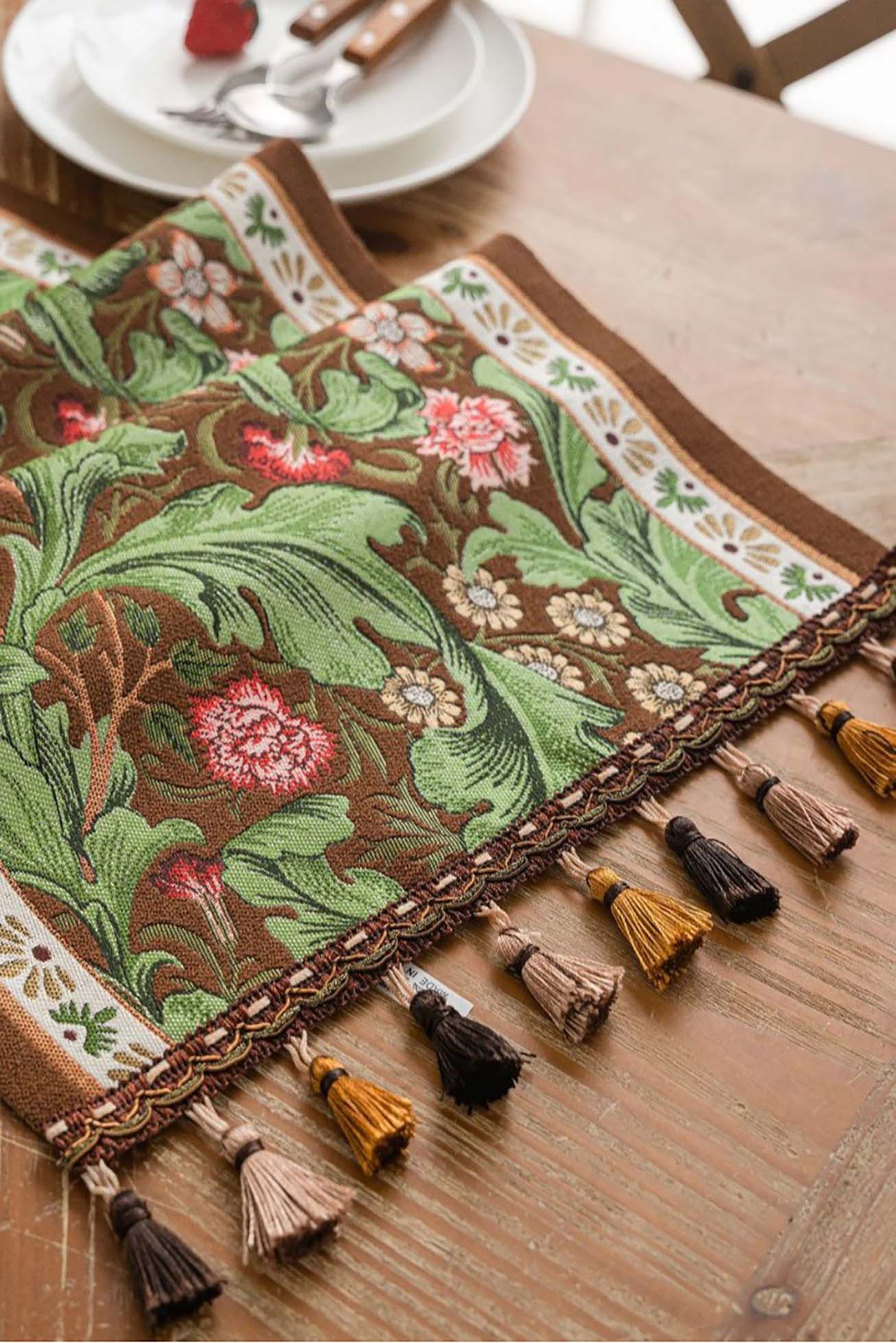 Bring timeless elegance to your table with this richly woven runner, featuring intricate floral patterns on a deep green backdrop. The detailed tapestry design adds depth and character, perfect for both everyday dining and festive occasions. Crafted for durability and style, it transforms any wooden or modern table into a warm and inviting setting.