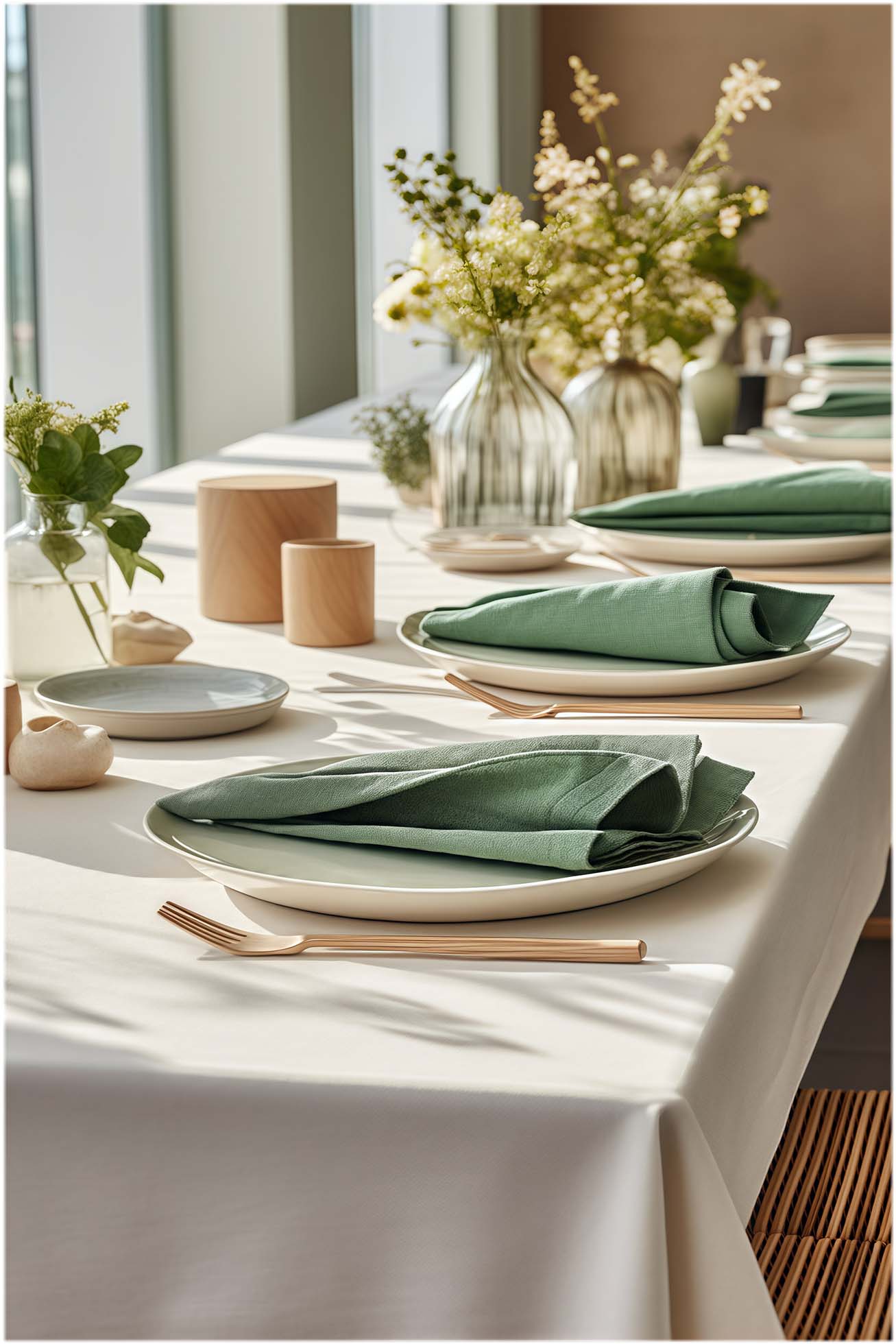 Jade green and flax beige. A pairing shaped by light, made for quiet tables.