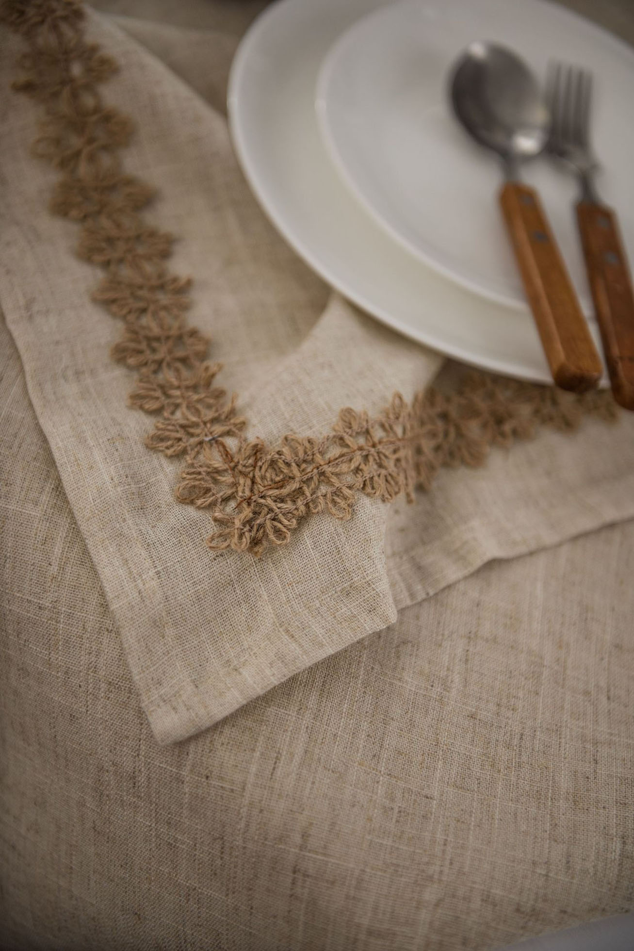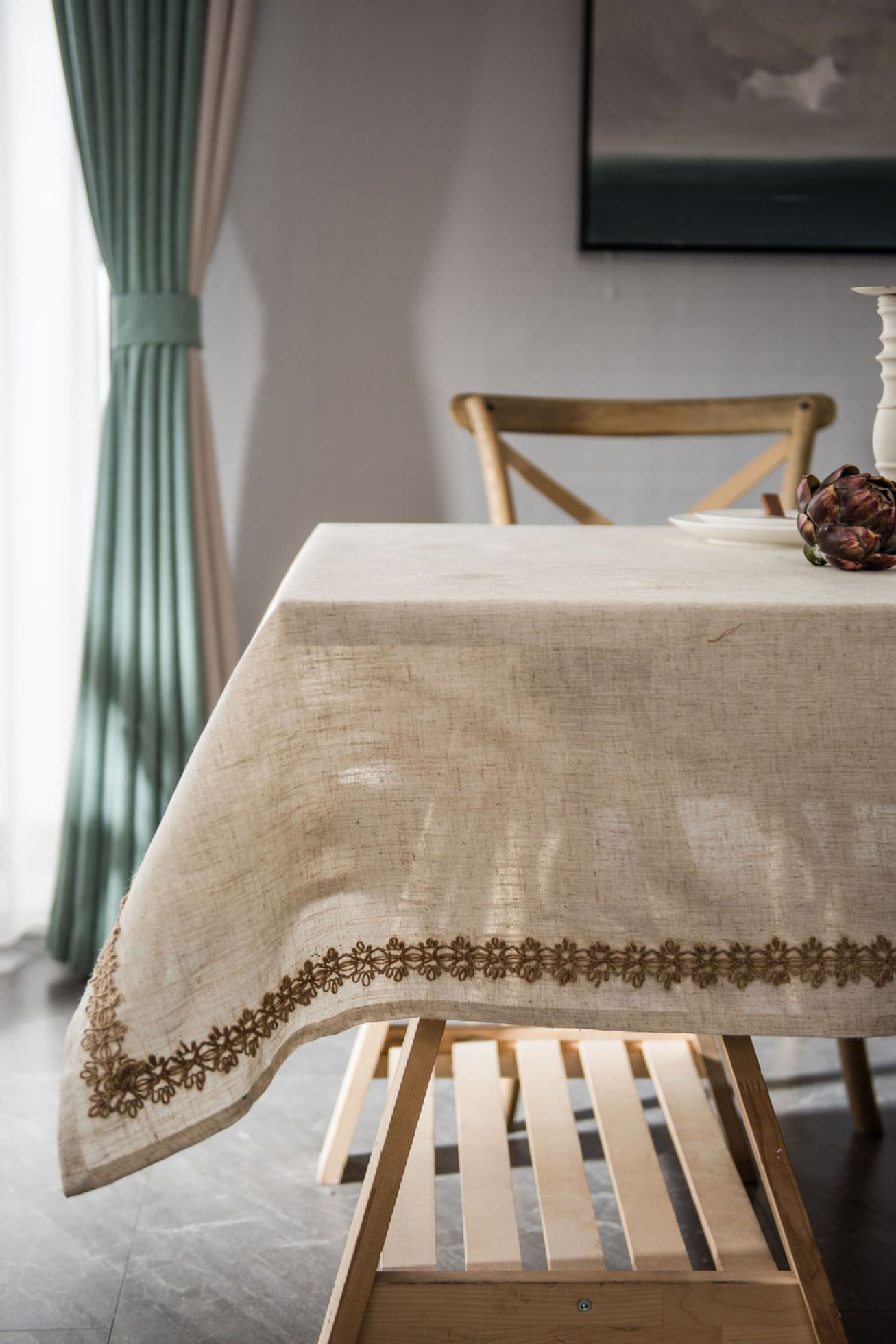 Beige polyester-linen blend tablecloth with delicate floral borders adds an elegant and refined touch. Perfect for vintage, French-inspired, or contemporary chic dining rooms, it brings a soft sense of sophistication to the setting.