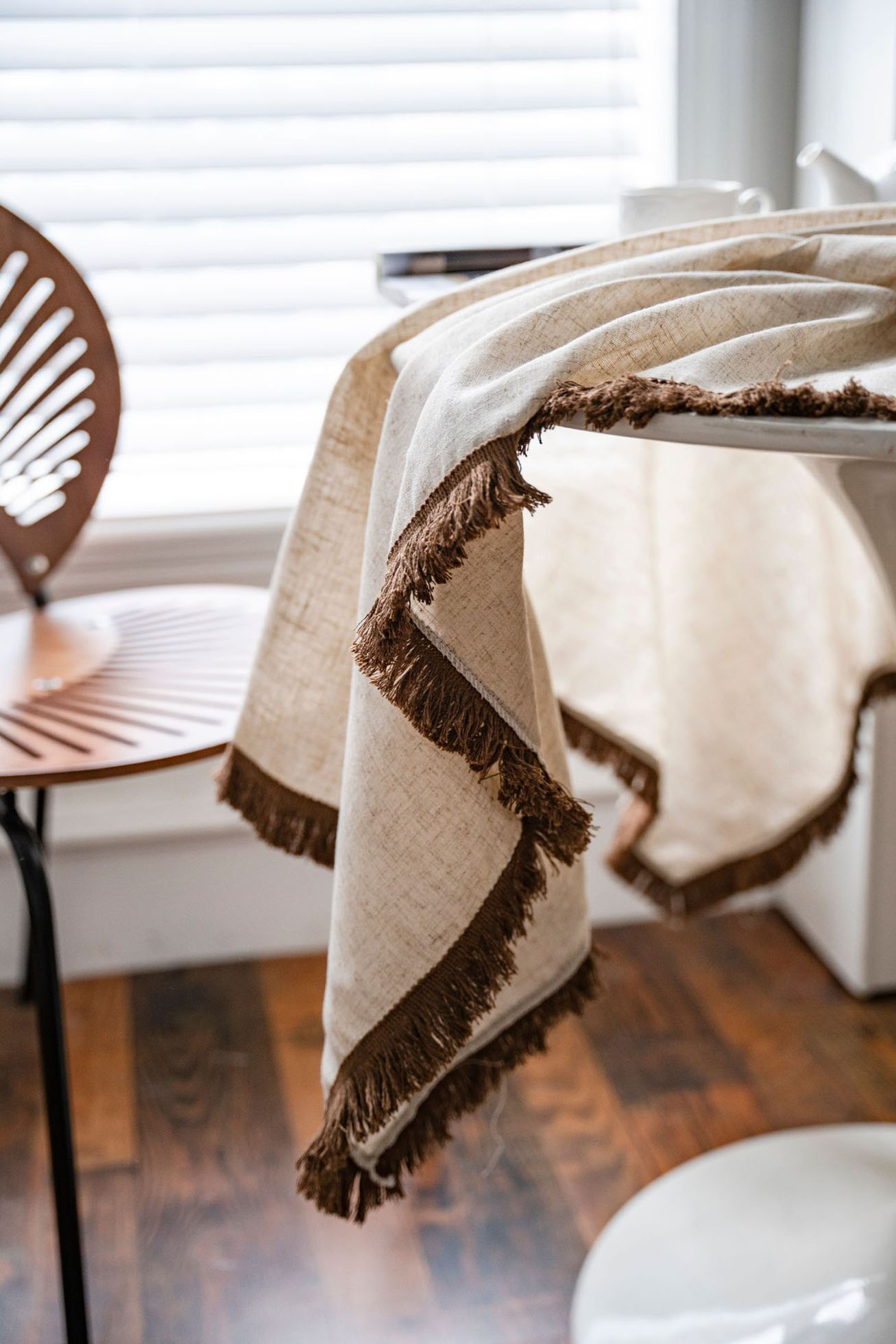 A warm oatmeal polyester-linen blend with dark tassel edges brings a rustic yet refined charm. Perfect for dining rooms with wooden floors, modern minimalism, or Scandinavian interiors, it adds cozy warmth to everyday meals.