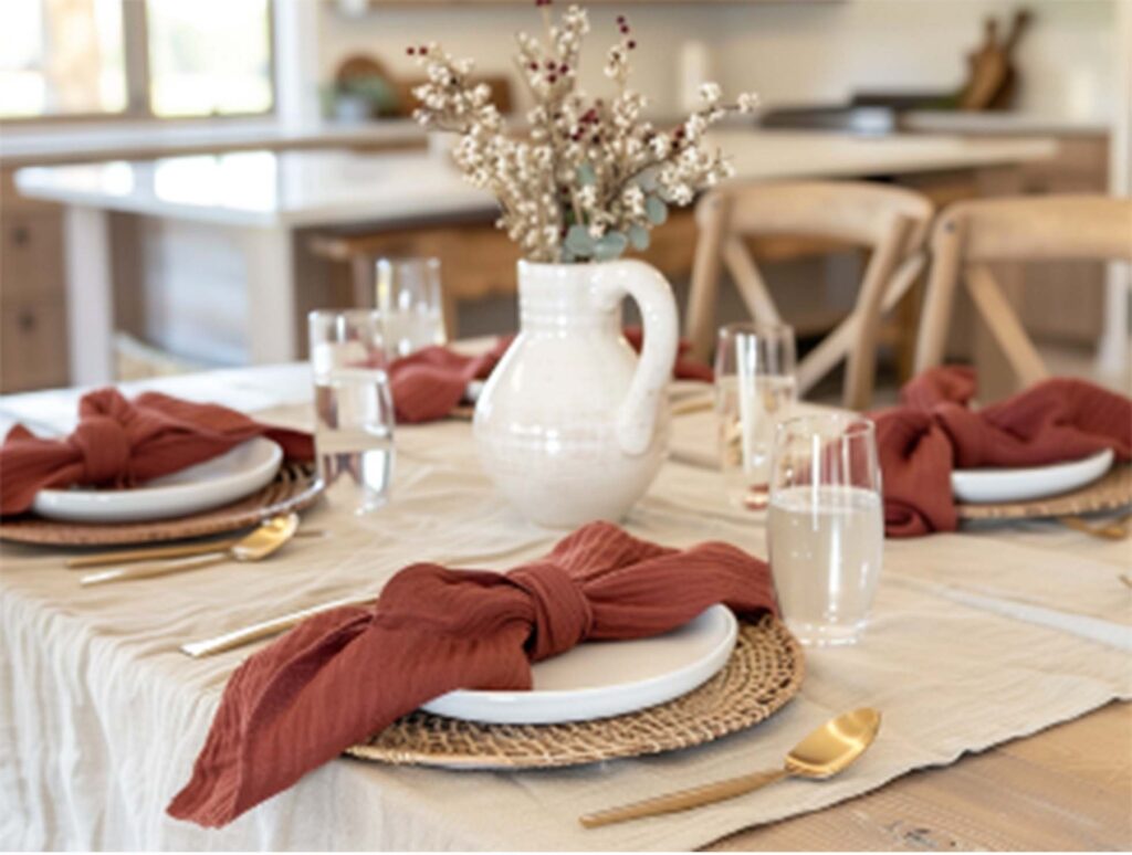 From napkins, placemats, and coasters to tea towels, runners, and tablecloths — every piece can be tailored to your style.